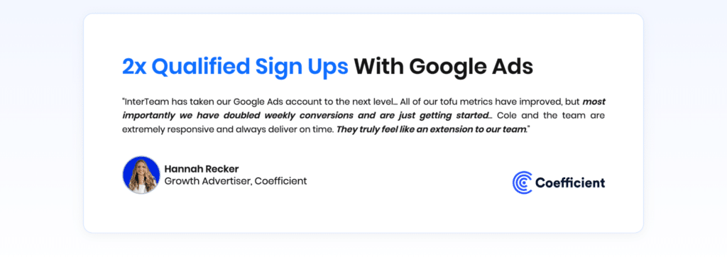 "InterTeam has taken our Google Ads account to the next level... All of our ToFu metrics have improved, but most importantly we have doubled weekly conversions and are just getting started... Cole and the team are extremely responsive and always deliver on time. They truly feel like an extension to our team."