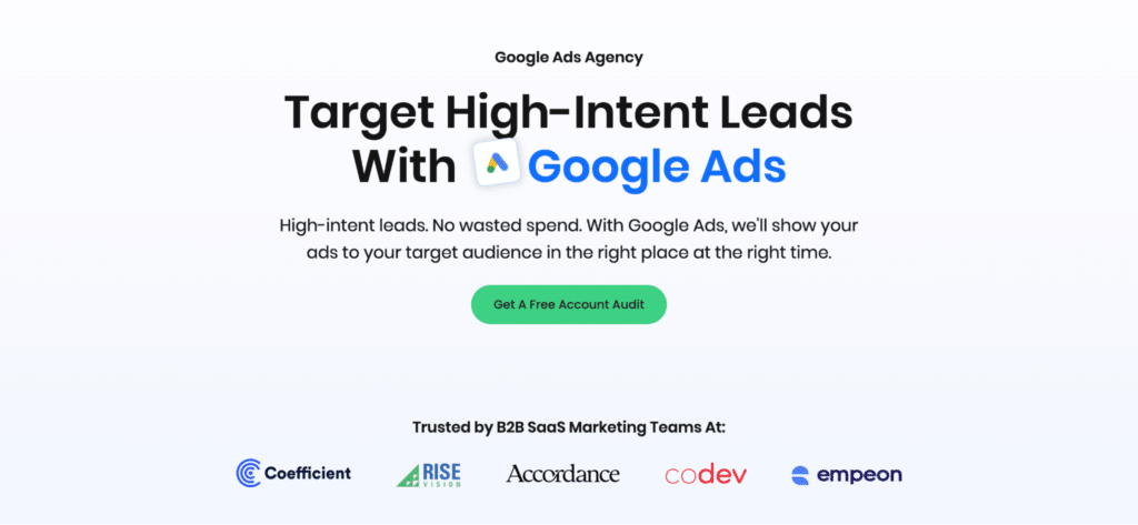 Their Google Ads strategy for B2B SaaS is built around three campaign types: branded campaigns that protect and reclaim traffic competitors are siphoning, high-intent keyword campaigns using exact match targeting to reach buyers in active evaluation, and competitor keyword campaigns focused on purchase-intent modifiers like “pricing,” “alternatives,” and “vs” queries. Bing runs in parallel for most clients, applying the same targeting logic at a significantly lower CPC.